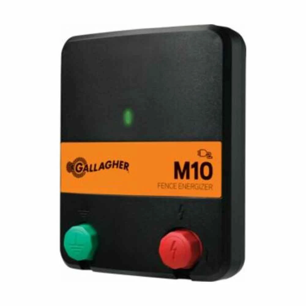 Power up to 10 acres or 2 miles of clean fence with the Gallagher™ M10 Fence Energizer. With 0.1 stored joules the M10 is ideally suited for small gardens and pastures. Simple 'plug and play' operation ensures successful installation even for inexperienced users. This energizer is robust and reliable with a tough outer casing and built in lighting diverter. You can check the power at a glance with the power on indicator